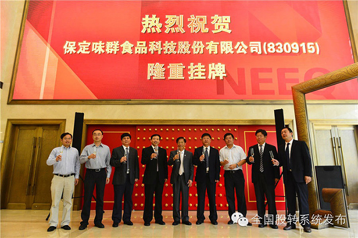 2014年,保定味群通過ISO22000食品安全管理體系認(rèn)證。 2014年,保定味群食品科技股份有限公司在全國中小企業(yè)股份轉(zhuǎn)讓系統(tǒng)掛牌,證券簡稱“味群食品”,證券代碼830915.